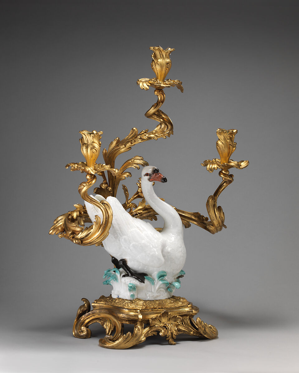 In eighteenth-century France, luxury merchants known as marchands-merciers combined expensive porcelain from Meissen with French gilt-bronze mounts to create distinctive forms of opulence, seen in this extravagant pair of candelabra featuring swans floating amidst flowering branches of gilt bronze.