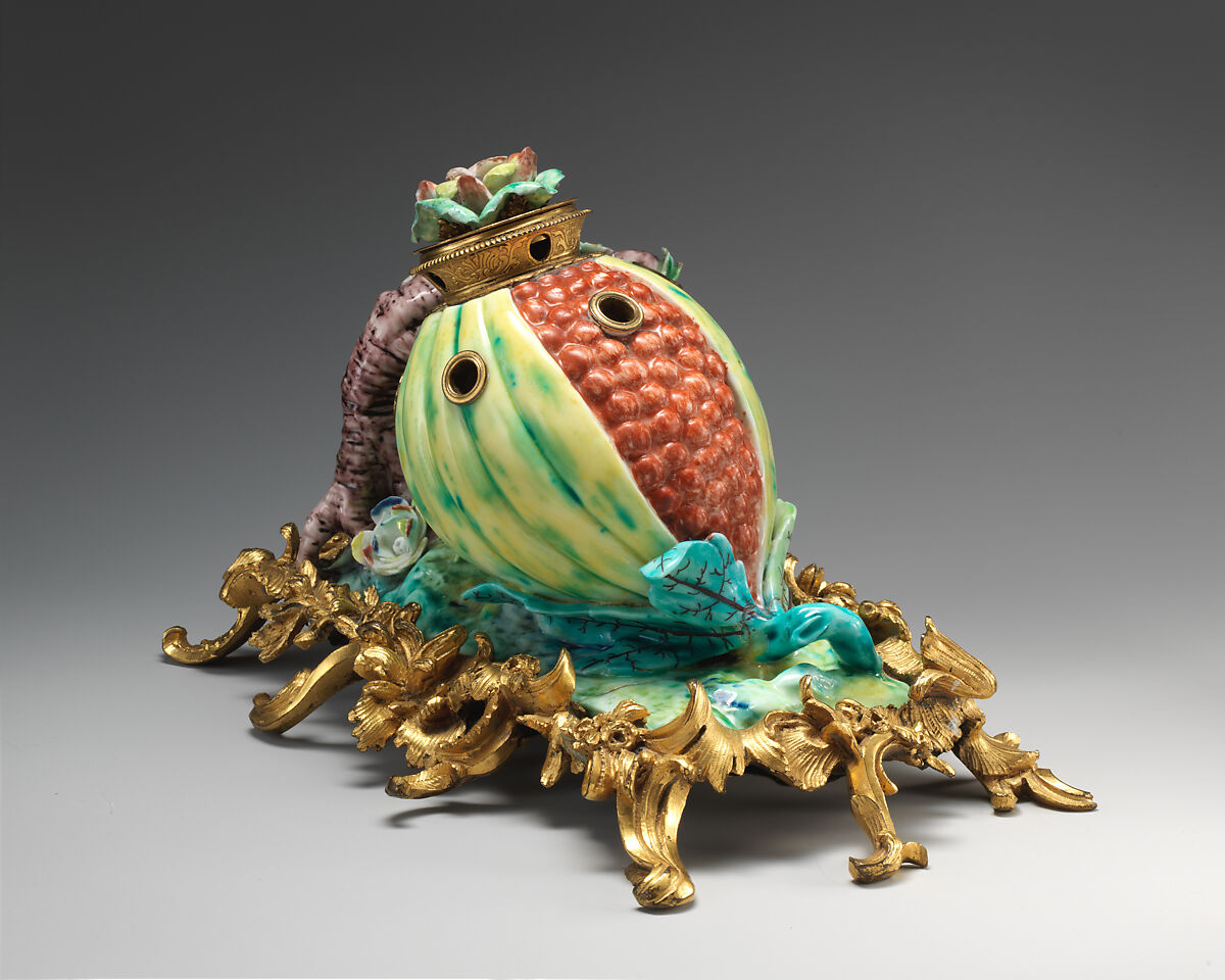 Before the royal patronage of Sèvres dominated the high-end ceramics market in the second half of the eighteenth century, small factories such as Chantilly, Mennecy, and Villeroy created experimental works that drew upon the Chinese and Japanese forms that inspired Meissen porcelain makers. An example of Rococo design, this vibrant inkstand demonstrates the ways in which French porcelain makers not only sought to recreate Asian porcelain, but catered to the desire for the fantastical and strange. The unusual form of a giant bursting pomegranate next to the gnarled roots of a tree turns a quotidian object like an inkstand into something out of a fairytale.