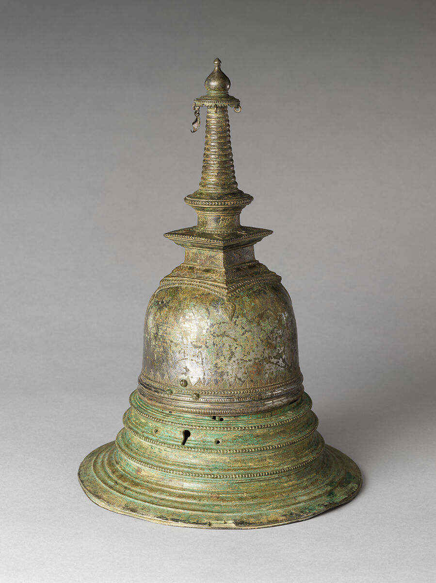 In Sri Lanka and Myanmar—both home to the Theravada Buddhist tradition—revered teachers of the dharma were honored with the internment of their ashes in a model stupa (Sinhalese: dagoba). These reliquaries were routinely housed in temples and shrines associated with that teacher. This example is cast and engraved with ornamentation around the harmika platform at the summit of the dome and bronze Bodhi tree leaves hanging from the umbrella spire.