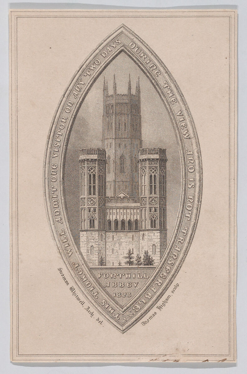 This print contains a small almond-shaped vignette with a view of the tower of Fonthill Abbey, a Gothic-Revival house built for William Beckford in Wiltshire. The print was made to function as an admission ticket for the abbey for visitors who came to see its contents before it was auctioned off in 1823. Presumably at least several hundred were printed, but very few survive due to their ephemeral nature. A second version of this ticket also exists, suggesting that visitor numbers succeeded expectations.