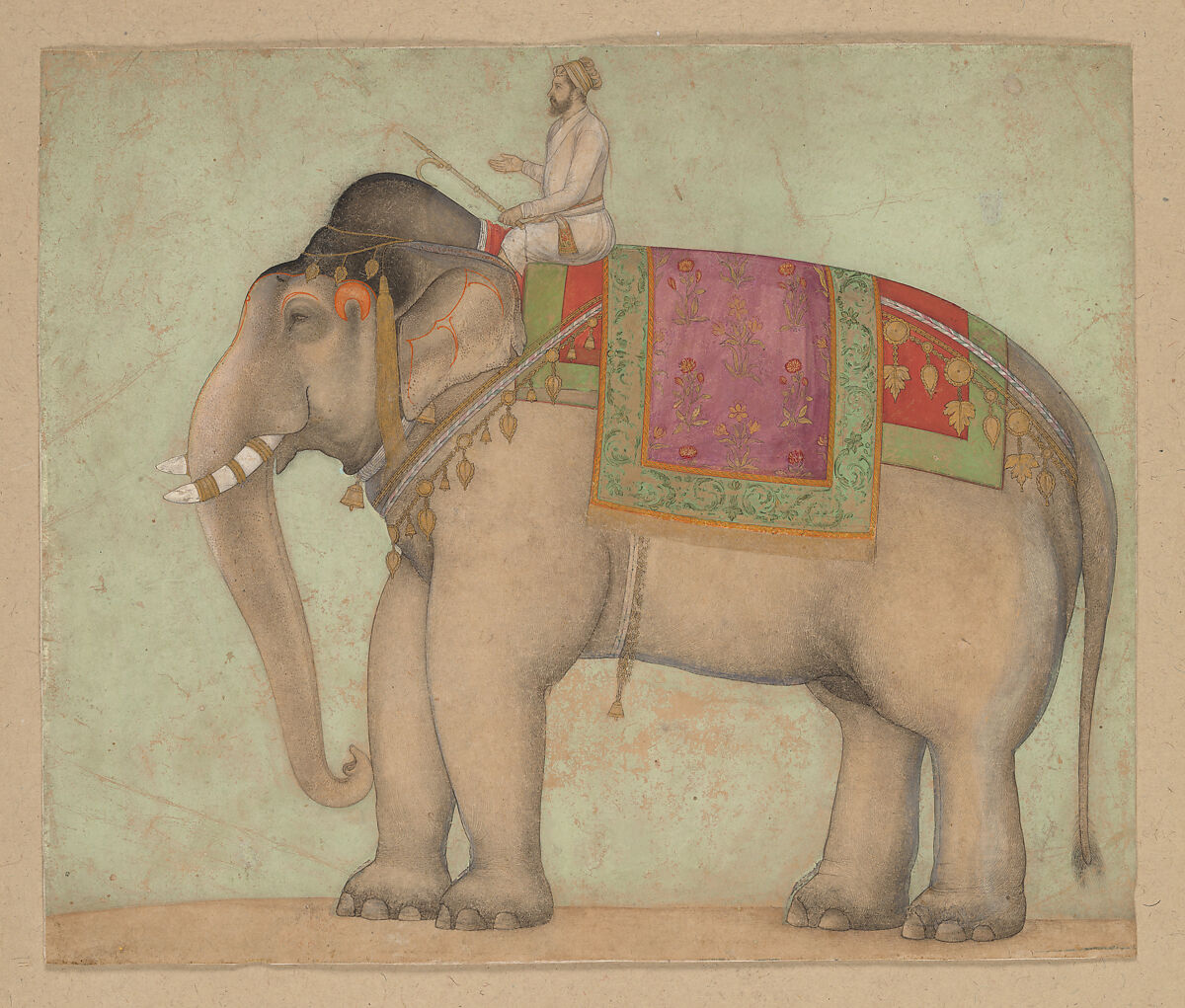 Mughal elephant portraits are distinguished for their outstanding observation of these majestic animals, dignifying them to the level of high courtiers by recording every feature with sensitivity. Here an imperial elephant stands in profile surmounted by his mahout, whose smaller scale serves to emphasize the grandeur of the majestic animal. The elephant stands untethered, a sign of his maturity and trustworthiness. It is caparisoned with trappings and bells, sacred orange-painted symbols on the face and a double back cover. While the saddle cloths bring in color accents, all other tones and background details are subdued to give the elephant the full importance on the page.
