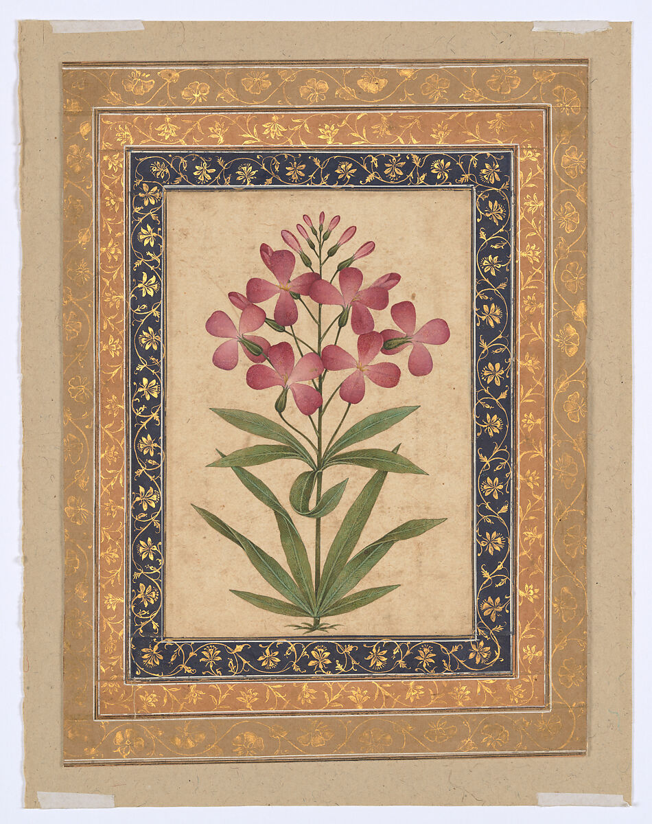 This work depicts a geranium plant with several pinkish-red flowers and buds sprouting from a central stem with a number of leaves. The painting has been mounted with three borders: the innermost in blue with gold floral motifs, the middle of orange and gold flowers, and the outermost on tan paper with gold flowers.