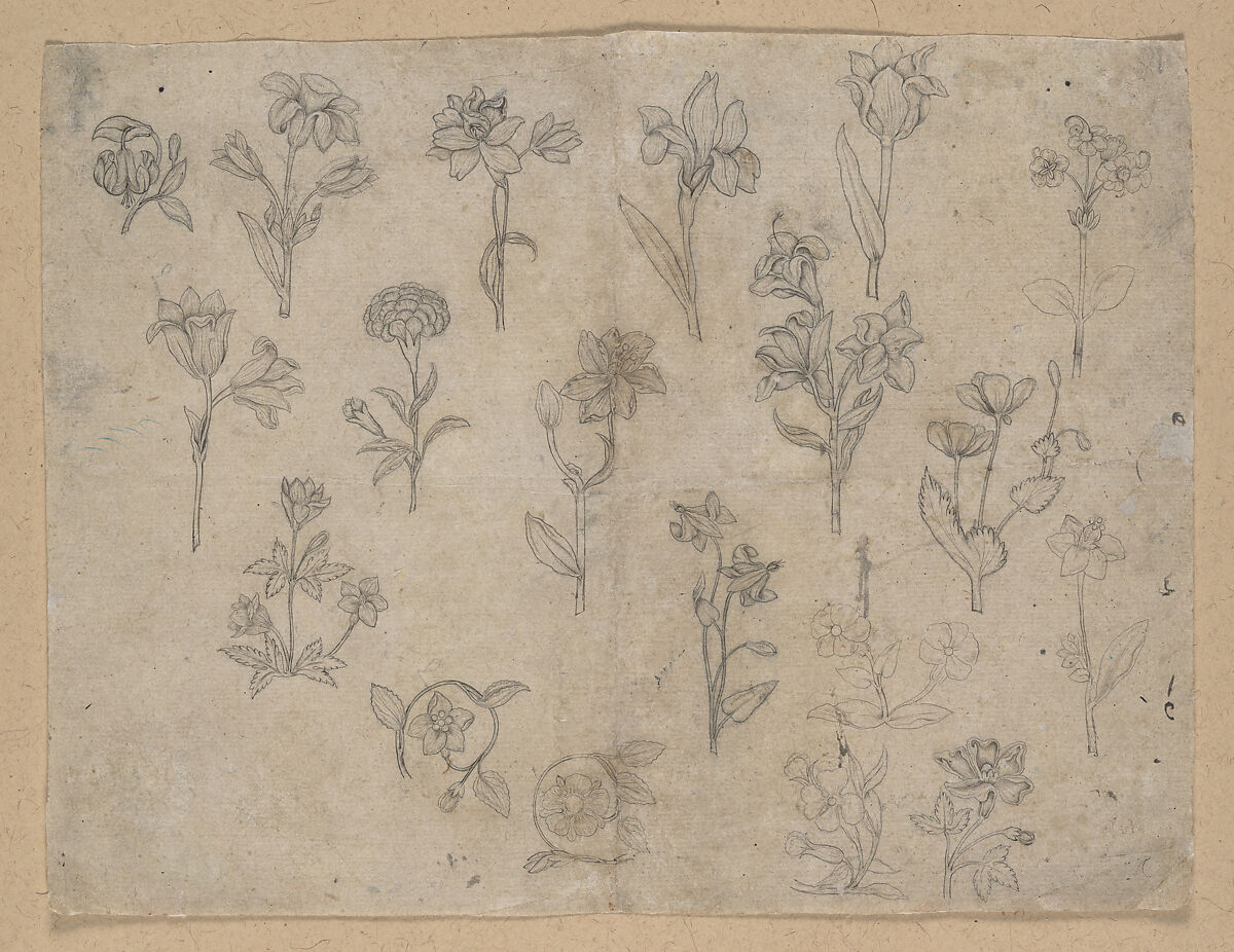 This practice-sheet of sketches by an unknown artist reveals the care and meticulous study that went into the creation of Mughal botanical studies in the seventeenth century. Created by an artist under the reign of Shah Jahan (r. 1628–58), this page of drawings in ink depicts nineteen different flowers, drawn from nature. Some of the skillfully rendered flowers may be specifically identified including lily, narcissus, iris, tulip, Persian violet, carnation, poppy, anemone, Trillium, and campion.