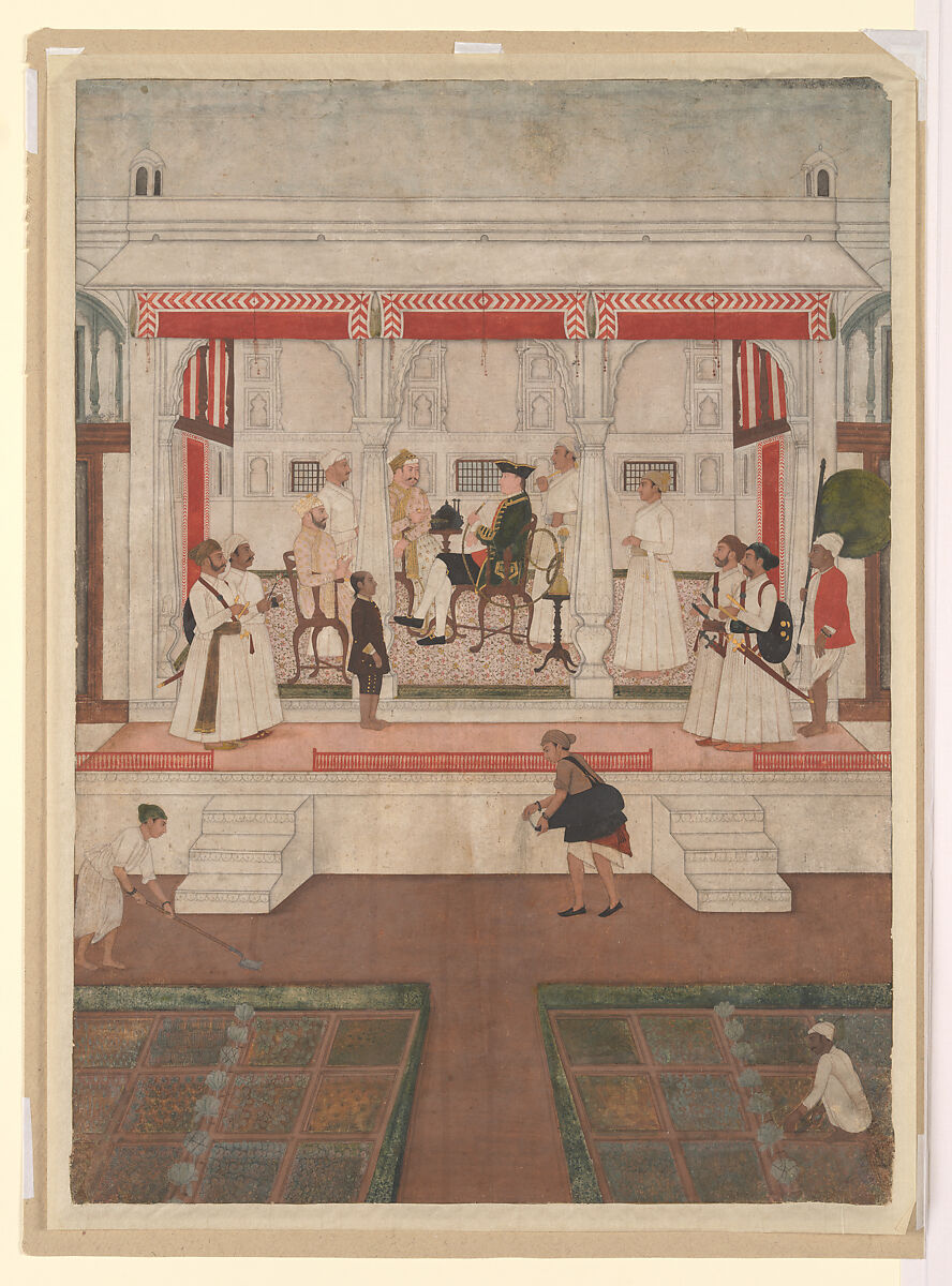 An unknown British officer, who was probably the patron of the work, is seated at the center of this scene receiving two guests who sit across from him. Attendants surround behind and in front of the figures, who are seated on chairs on a raised white marble audience chamber. This tableau lends insight into the hierarchies of colonial India by an anonymous artist who has a great feel for ceremony and social strata at court.