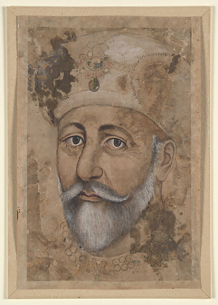 This work of art is currently on loan to the museum.Europeanized in its full-face pose and modeling, this portrait depicts the last Mughal emperor, Bahadur Shah II (r.1837–58). For his nominal leadership of the Indian rebellion of 1857, the poetry-minded king was deposed by the British and died in exile in Burma (Myanmar).