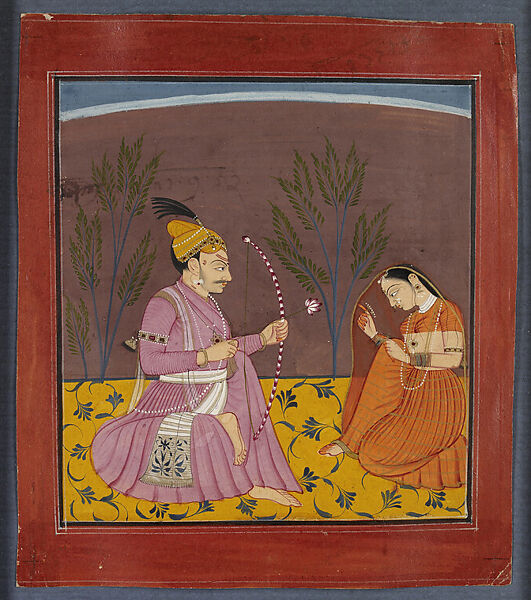 This work of art is currently on loan to the museum.This folio illustrates the romantic mood of the Kusuma Raga, depicting an amorous encounter between a princely man and woman, the overtly sexual imagery conveyed by the bow of stringed flowers with a lotus-bud tipped arrow aimed at the coy woman. The name Kusuma poignantly refers to the cactus flower that blooms for a night, only to wither and die the next day. The couple are both richly dressed, the man with jewelry and a yellow turban secured by a jeweled headband and feathered turban ornament (sarpech). The woman wears an orange sari banded with gold thread, and with the veil drawn forward to partly conceal her face in a gesture of modesty or coquettishness. Whilst the traditional rendering of this subject is for the prince to be seated on a lotus and to hold lotus blooms in his hands, in this Pahari Hill’s version the lotus blooms have been transformed into floral bow and arrow, the weapons of Kamadeva, the Indian god of love.