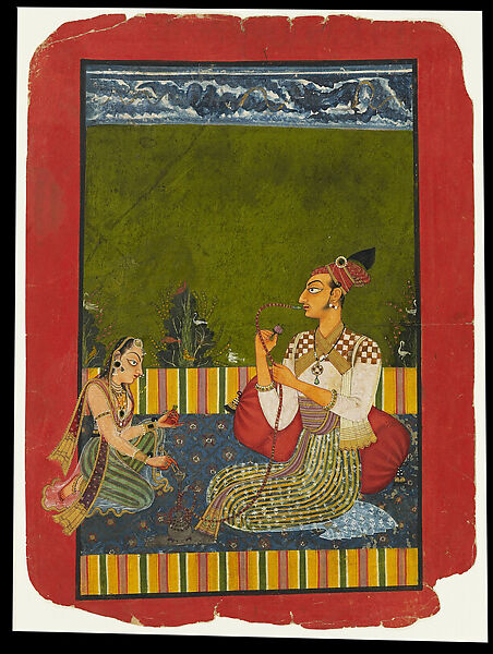 This work of art is currently on loan to the museum.This poignant depiction of the youthful Medini Pal (r. 1722–36), who came to the throne at the age of six and died at twenty-two, belongs to a long tradition of ruler portraits in which they are shown at ease in the privacy of the inner court. The adolescent raja is seated with a young courtesan on a roof terrace; he holds a scented flower bud, evoking ascetic sensibility, and a hookah pipe, from which he is imbibing. To add to his sensual intoxication, his companion prepares a chewing quid of paan, a mild stimulant. In the tree are pairs of migratory Siberian white cranes, fabled for their fidelity, and in the upper register is a monsoonal sky with gold serpentine lightning. By introducing the symbolism of cranes and a stormy sky, the artist borrowed visual metaphors familiar from the genre of ragamala mood painting to evoke an amorous atmosphere.