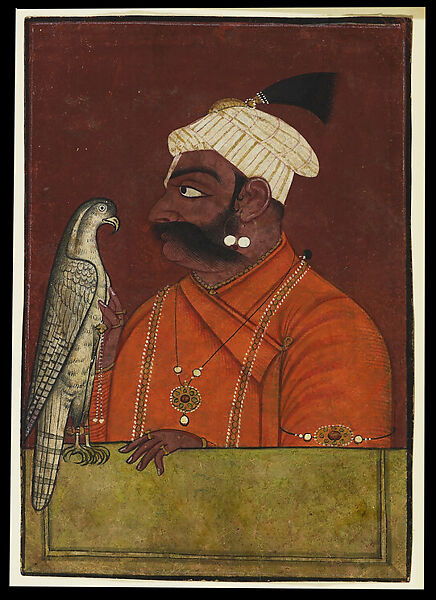 This work of art is currently on loan to the museum.The ancestry of falconry, a sport much favored by Indian rulers, can be traced back to the seminomadic peoples of Central Asia. As expressed in Hindu court painting, this vogue is directly attributable to the fashion established by the Mughal courts. The refined hunting abilities of predatory birds, such as their strength and speed in striking prey, were qualities much admired in the martial culture of the Hindu courts. Rajput and Pahari rulers recorded their most beloved animal—birds of prey as well as elephants and stallions—in paintings, both for enjoyment and to chronicle the accoutrements of their reign. Here we see the ruler of a small Pahari hill state, Maharaja Suraj Mal of Nurpur, posed with his prized hunting bird.