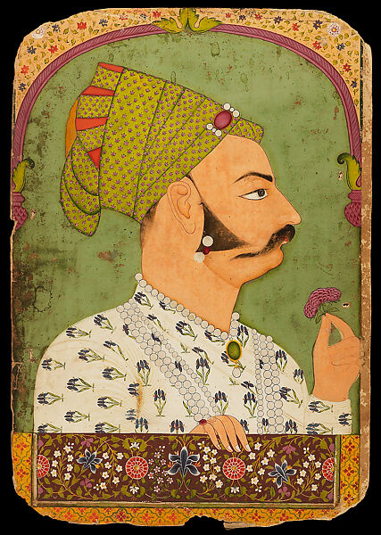 This portrait, one of the finest from eighteenth-century Rajasthan, was painted at Nagaur Fort in the kingdom of Marwar. The subject, Bakhat Singh (1706–1752), younger brother of Marwar’s ruler, was appointed governor of the fort, within which he constructed a pleasure palace decorated with elegant floral designs. Widely known as an accomplished poet and patron of the arts, he helped foster a culture of painting and poetry at the fort that flourished for twenty years. Seen here poised at an audience window (jharoka), he rests one hand on the carpeted windowsill and holds in the other a fragrant rose, the quintessential pose for a connoisseur. Royal portraits were routinely used as diplomatic gifts between courts, likely the purpose of this work.