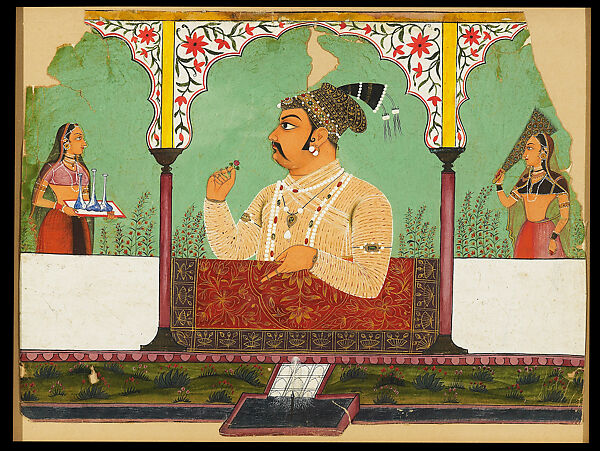 This highly personal portrait of Raj Singh of Sawar (r. 1705–30) shows him in full profile, as if he is presenting himself at a palace balcony window (jharoka) for a public audience. Here, however, the arched terrace at which he sits resplendently is set in a private garden overlooking a grassy landscape populated only by waterfowl. In this private inner world, Raj Singh holds a flower bud in his raised hand, an allusion to his aesthetic accomplishments. He is attended by two women, one holding a tray with slender glass bottles of rosewater and the other waving a fan of peacock feathers. The arcade is painted with floral designs in the style of Mughal pietra dura (hardstone inlay), and a Mughal-style carpet is draped over the terrace balustrade, adding a richness to the portrait.