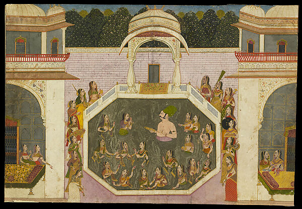 This work of art is currently on loan to the museum.Maharaja Vijai Singh of Jodhpur (r. 1752–93) stands bare-chested in an octagonal bathing pool along with eighteen women of the zenana (harem). The pool is enclosed by a white marble openwork (jali) balustrade, and the water is painted silver (now darkened with oxidization). A small marble pavilion with a sweeping roofline and richly patterned rug mark his royal seat. Singh wears a green lungi (skirt cloth) with a golden cummerbund and a dramatically large green turban, as was the Jodhpur fashion. He holds a metal syringe with which he playfully douses the women with water, recalling the annual Holi spring festival.