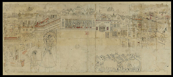 This work of art is currently on loan to the museum.This unfinished drawing is a full-scale cartoon for a section of an altar hanging (picchavai) for a shrine devoted to Krishna as Shri Brijnathji Vallabha. The rendering of turreted palace architecture links the drawing to Rajasthani images from Udaipur, while the stylized depiction of the women reflects the ideals of feminine beauty as celebrated in eighteenth-century Kishangarh painting. The scene depicts the moment at dusk known as “cowdust hour,” when the herds and their minders return from the fields accompanied by Krishna, whose arrival is eagerly awaited by an assembly of young women. The cows are drawn with great sensitivity, their dewy eyes evoking sweet contentment. This finished picchavai was intended to be displayed during the celebration of Sandaya Arati, the offering of light to honor the deity in the summer month of Shravan, in late July–August.