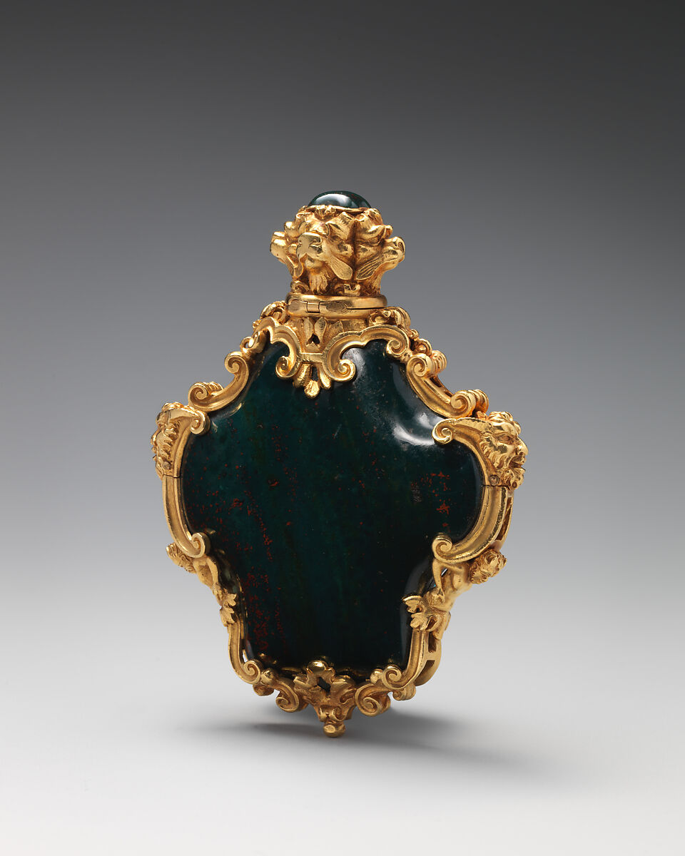 Imported from overseas, bloodstone has long been thought to have healing and protective properties beneficial to people who own it or carry it on their person. In addition, the perfume stored inside this elegant bottle not only made up for the lack of personal hygiene but also helped to ward off foul odors, which were though to carry disease. This gemstone owes its name to the randomly arranged red splashes of iron oxide minerals which look like spattered blood.