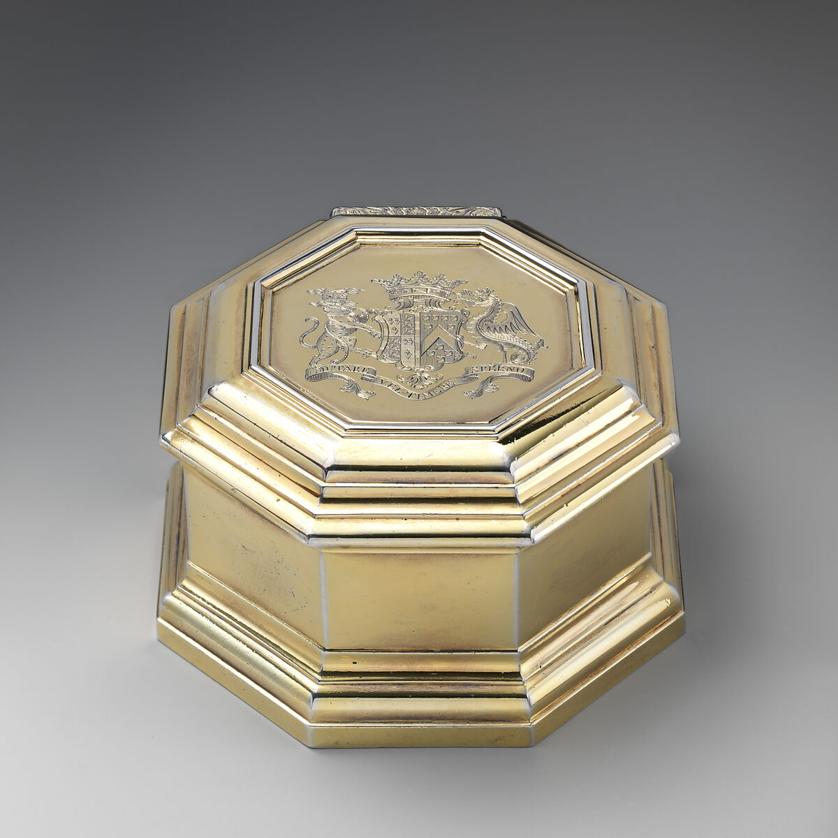 This octagonal silver-gilt box with the arms of Henry Somerset-Scudamore, 3rd Duke of Beaufort (1707-1745). It was made by London silversmith John White in 1729 and formed part of the larger 'Beaufort Toilet Service', which included further boxes, a basin, and an ewer. Beaufort is best known for having commissioned the Badminton cabinet, an enormous pietre dure piece of furniture made in Florence and now in the Gartenpalais Liechtenstein in Vienna. Margaret Burr, Beaufort's illegitimate daughter, married Thomas Gainsborough, one of Britain's most significant portrait painters.