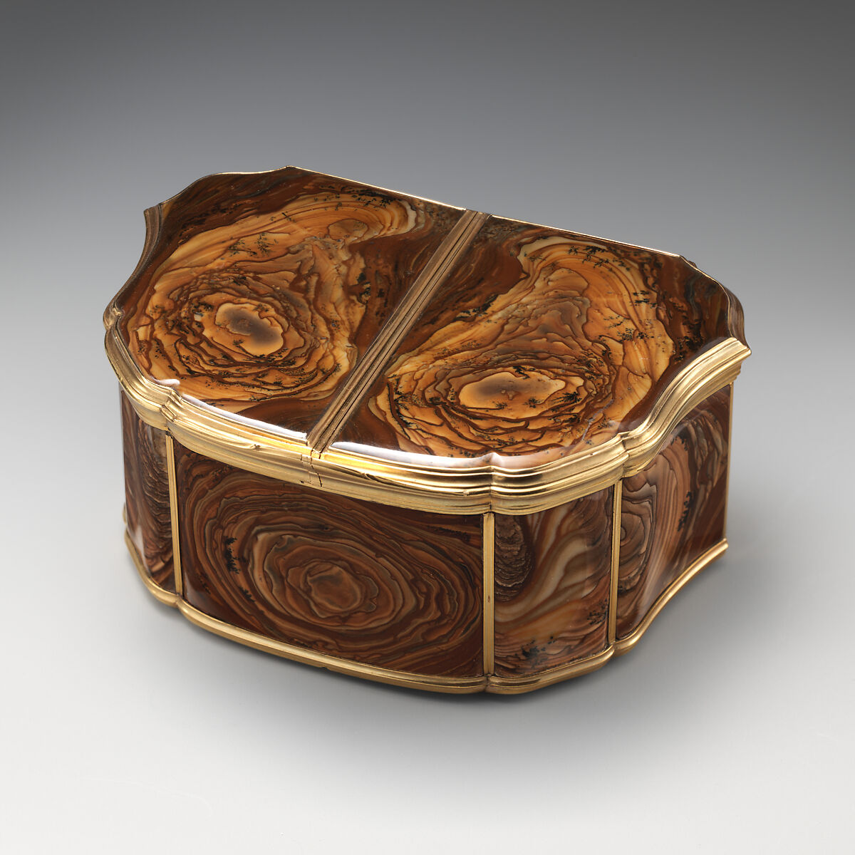This double snuffbox consists of two compartments, which can be opened separately. Airtight when both lids are closed, this box could carry two different types of snuff. The size of the box suggests that it was for communal use on a table rather than to be carried around in one’s pocket. The maker, Nicolas Bouillerot was one of the first Parisian goldsmiths to mount hardstones in snuff boxes, a tradition already established in Saxony earlier in the century.