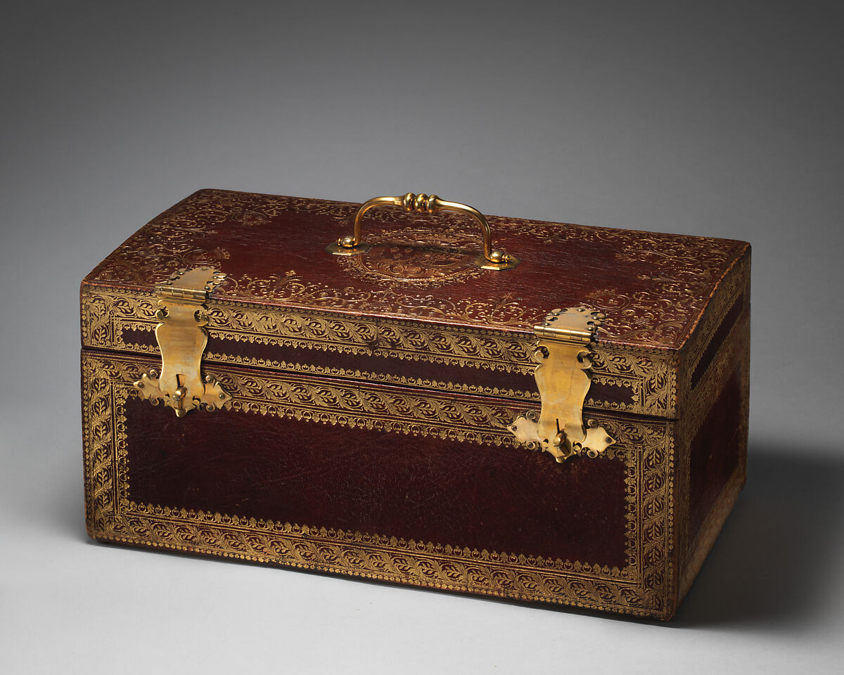 Leather boxes and trunks served in 18th century France for the storage and protection of personal belongings when the court moved from one residence to the next. The coat of arms struck on the lid of this coffer indicates that it was intended for Marie Thérèse of Savoy as Countess of Artois. It is possible that the coffer was made on the occasion of her 1773 marriage to the younger brother of Louis XVI.