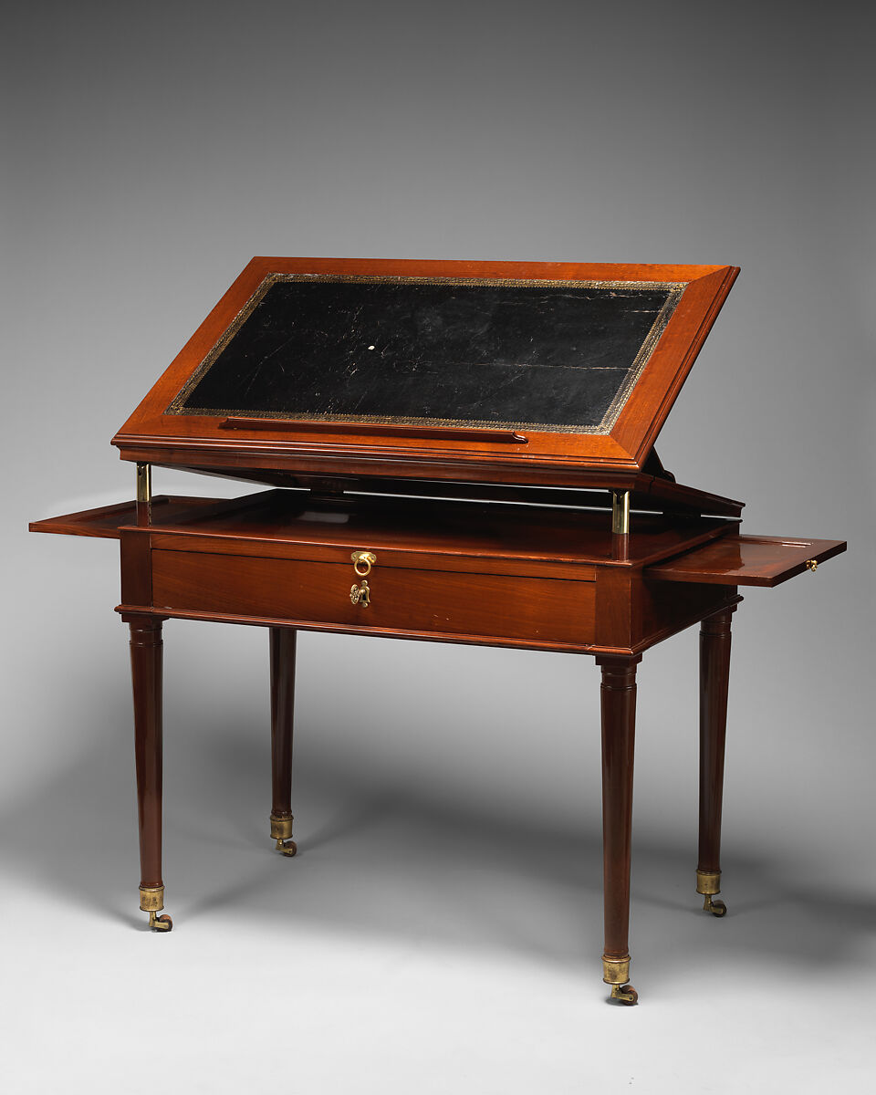 French eighteenth-century furniture was either designed for a very specific usage or served multiple purposes. This table falls into the latter category since it could be used for writing, reading or drawing both in standing and seated positions. This table shows similarities with the multifunctional tables the German cabinetmaker David Roentgen supplied to Catherine the Great of Russia and other patrons. Called table à la Tronchin in French after the Swiss physician Théodore Tronchin, an advocate of the value of fresh air, exercise, and a moderate lifestyle, who would have recommended its use to patients who worked for many hours in a seated position.