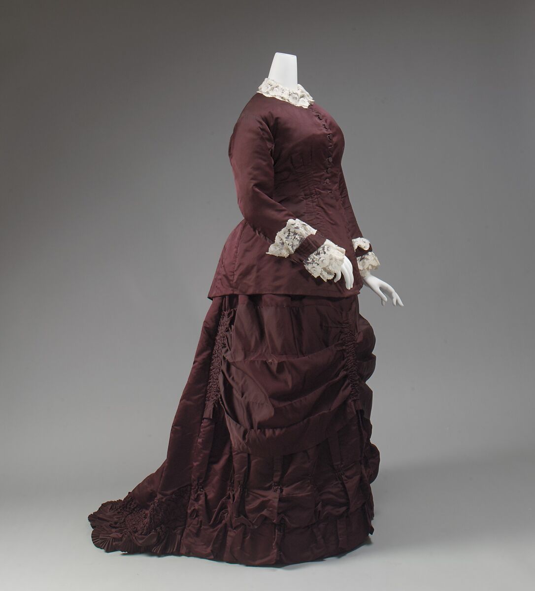 With the mechanization of sewing becoming ubiquitous, as well as the Victorian penchant for machine-made trimmings such as braid, lace and ribbons, women's dress became the foundation to which elaborate surface decoration was applied, not unlike the mass produced ornate trims added to the exterior of Victorian homes. These two examples poised in the brief period between the vogue for the lighter, puffed bustles of the 1870s and the more heavily upholstered bustles of the 1880s were seen in their day as à la sirene, or mermaid-like, in silhouette. Their extended bodices, called the "cuirasse" since they encased a woman's torso like body armor, were the clearest 19th century expression of the hourglass shape.
