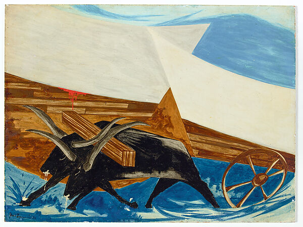 This work of art is currently on loan to the museum.Lawrence’s final panel from the Struggle series derives from a utopian pamphlet written and published by Morris Birkbeck, an English-born Quaker and abolitionist, for his British compatriots. Birkbeck used his travel accounts from the coast of Virginia to the territory of Illinois to advertise the promise of a fresh start, even a new society, in the American West. Lawrence filled the picture plane with the unrelenting forward movement of covered wagons, hauled by oxen over uneven terrain. A conspicuous splash of blood represents those who sacrificed and died for a new life of freedom, one that precipitated the mass displacement and subjugation of Indigenous people.