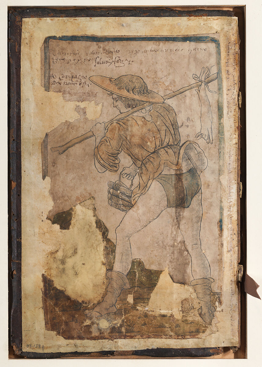 The first of two engravings pasted to vellum end papers to the inside (now separated) covers of a XV century Latin book of medicine, the Antidotarium Nicolai (editions, 1471, 1478/9 etc). Two folios of text from the book (printed recto and verso) now mounted separately accompany the prints. The wooden boards are covered with worn, stamped brown leather, metal boss and clasps. Hind notes that these prints are Ferrarese or Paduan. Both sheets have 'cries and invectives' written apparently in a Venetian dialect.