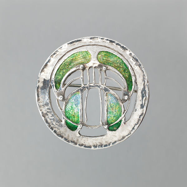 The artistic production of this group, which called themselves “The Four,” ranged from paintings, drawings, and posters, to textiles, metalwork, jewelry, furniture, and interior design. The Macdonald sisters became especially skilled in jewelry and enameling, but unfortunately little of their jewelry survives. However, the initial R engraved on each of the present brooches appears on a certain objects made by Frances McNair, to whom this group was attributed when it was sold at Christie’s, London, in 1992. Especially characteristic of the Glasgow style are the Mackintosh-style roses enameled her in orange against green.