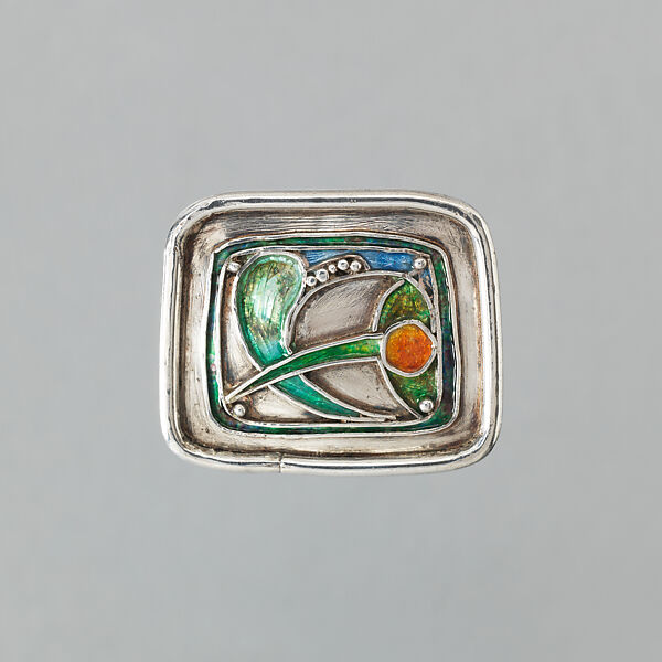 - Title: Rectangle brooch with stylized flower (?) in green, orange, blue enamel