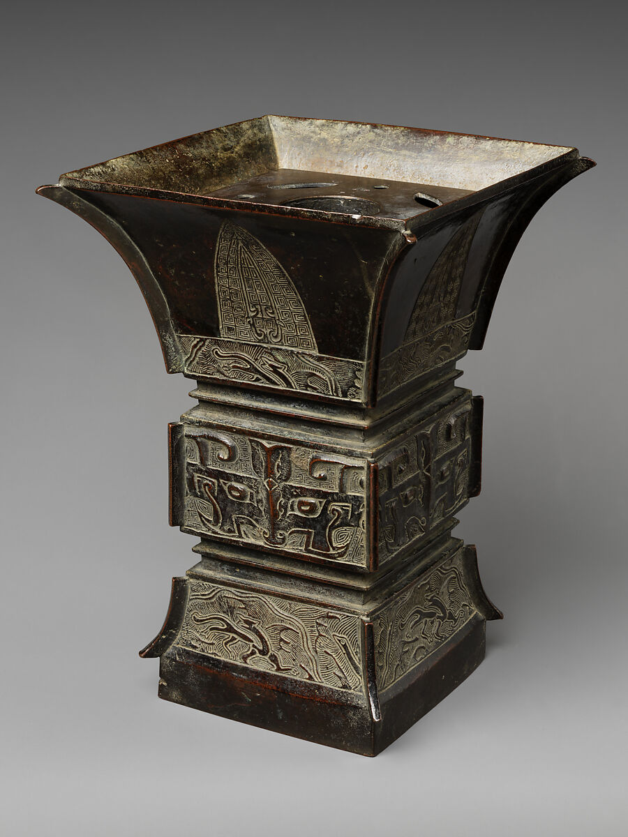 This vase exhibits a monumentality that belies its small size. Its square shape—most such vessels are round—further adds to its assertive presence, as does its crisply cast bold decor. Combining the decorative patterns of the Shang, Zhou, and Han periods (ca. 1600 BCE–220 CE), the vase conveys a hybrid style that distinguishes it as a “new antique” rather than either a faithful copy or a fake. Covered in a lustrous dark patina, its linear design allows it to hold flower branches, typical of those vases circulating in Japan since the fourteenth century.