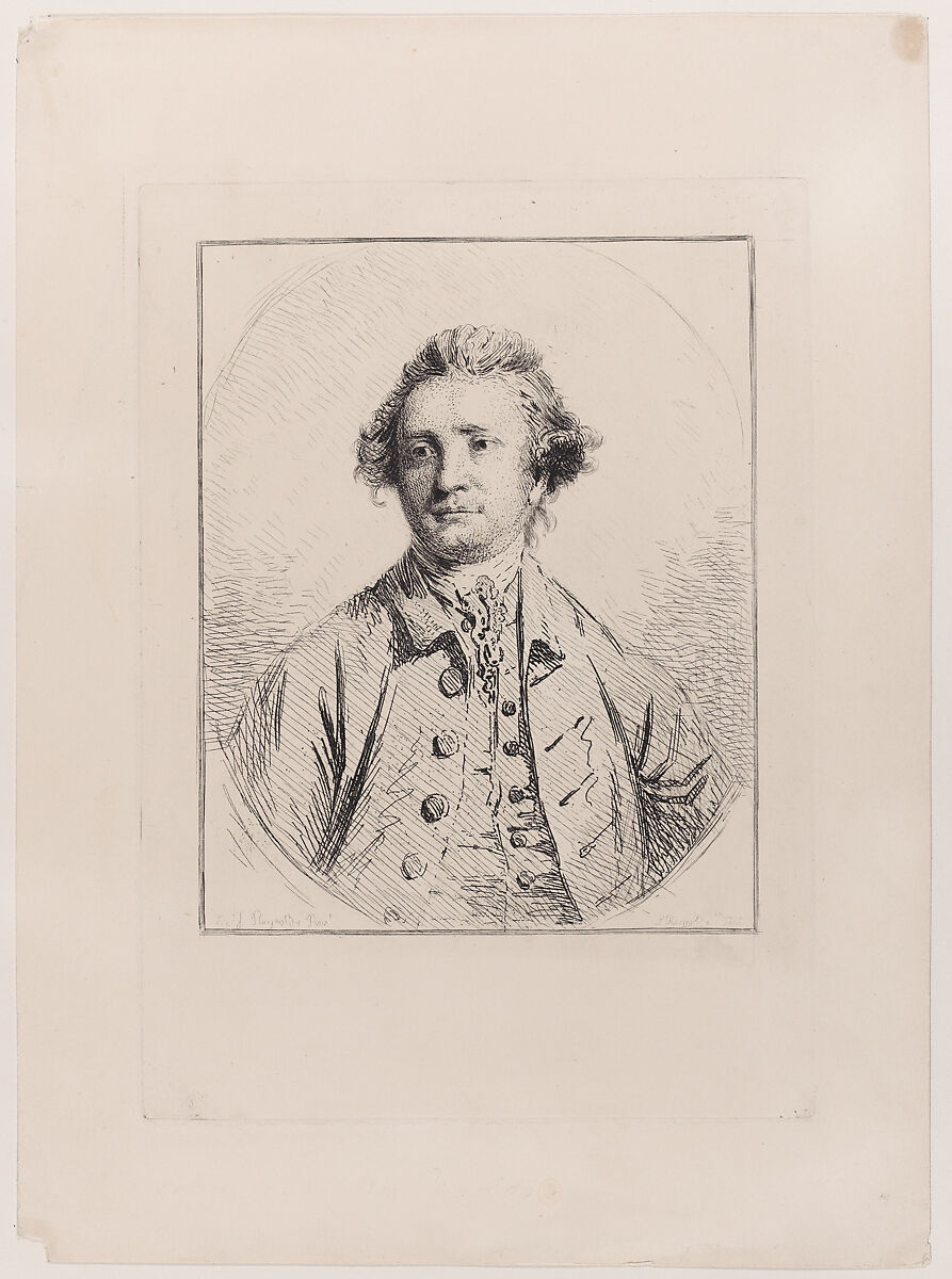 Half-length portrait of a man within an oval, the etching is based on Reynolds's portrait of Colonel Dow (Mannings 521) who is shown bareheaded, wearing a plain unbuttoned coat over a waistcoat. Born in Scotland, Dow was an officer in the East India Company and also a writer and playwright.