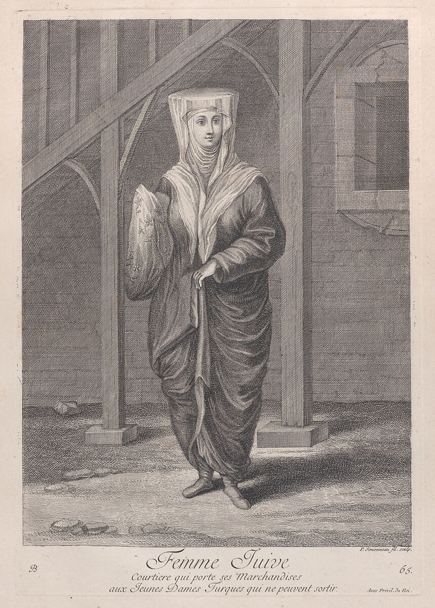 - Title: Femme Juive, Courtiere qui porte ses Marchandises aux Juenes Dames Turques qui ne peuvent sortir, plate 65 from "Recueil de cent estampes représentent differentes nations du Levant"