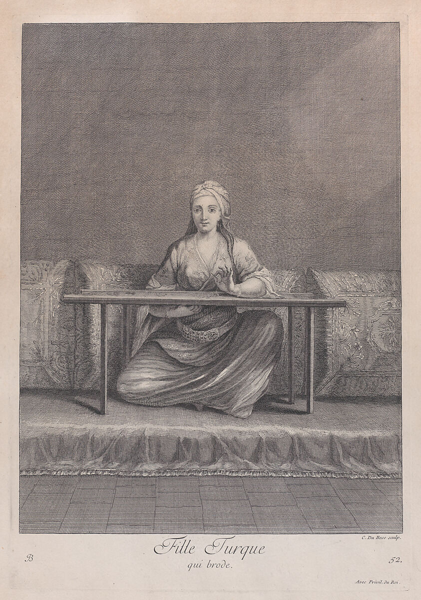 - Title: Fille Turque, qui brode, plate 52 from "Recueil de cent estampes représentent differentes nations du Levant"