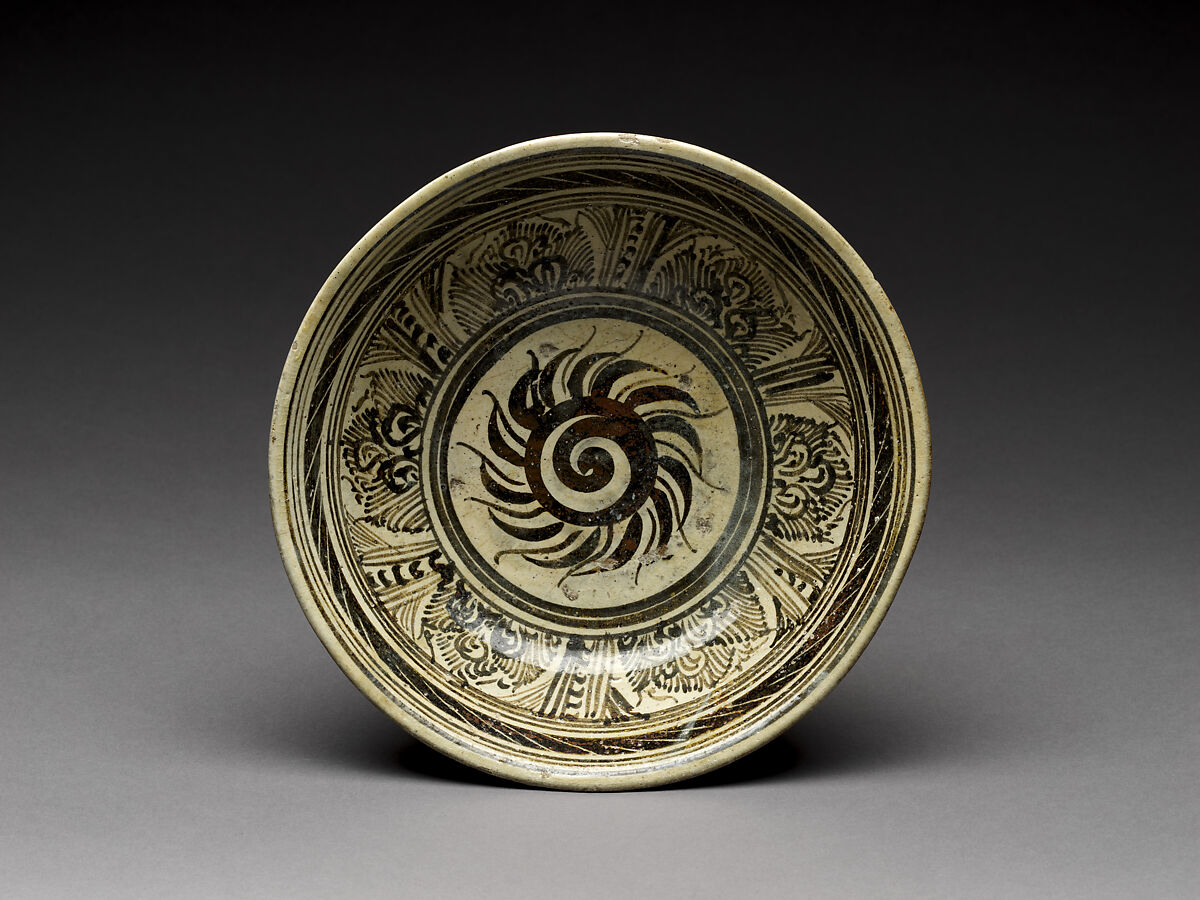 This bowl with a flaming solar-disk symbol at the center of its interior, often termed a chakra (Skt: wheel, associated with the Buddha’s teachings), is a classic product of the earliest glazed ceramic industry in Thailand, This industry emerged in the course of the 14th century, as witnessed by the Turiang shipwreck located of the east coast of Malaysia and dated to the 1370s. Later shipwreck cargoes demonstrate that the Sukhothai kilns remained active well into the 15th century.