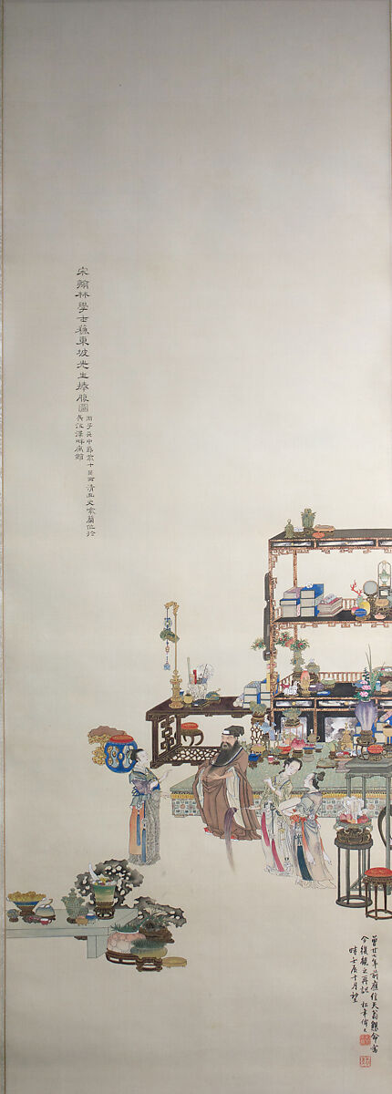 The famous Chinese poet Su Dongpo (Su Shi, 1037–1101) of the Song dynasty and three richly clad women stand in a space filled with the ideal accoutrements and furnishings of a scholar-gentleman: carved bookcases littered with books, flowers, and ornamental objects, small tables displaying more decorative objects, a carpeted dais, and the convoluted and perforated rocks, often called Lake Tai rocks, with which scholars loved to ornament their studies. The poet converses with the woman facing him, while the other two ladies speak with each other. There appears to be a narrative element to this image, and it is possible that it represents a popular story about the poet, his verbal exchange with a Chan (Zen) Buddhist monk named Foyin, and his laughter when he returned home and recounted the meeting to his sister. It may also reference an anecdote in which Su Dongpo asked his concubine and maid servants if they knew what his belly was full of. As the poet is shown resting one hand on his protruding stomach, the latter tale may have been the inspiration.