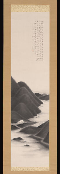 This brooding landscape of dark mountains and water was created using applications of dark ink washes to contrast with blank space that represents water and sky. The mountains, with their rounded triangular shapes, recede into the distance as overlapping forms with little change in ink gradation. The zig-zag composition, which fills the lower half of the picture plane, is accented by the winding path along the shoreline, and offset by vertical lines of the inscription above. The impression is one of an eerie silence and stillness.