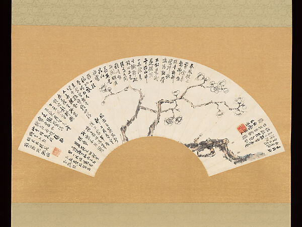 A gnarled and twisted plum tree in bloom twists in and out of the curved picture plane formed by the arc of this folding fan. The remainder of the fan’s surface is filled with poetic inscriptions in Chinese by the artist. Although light touches of color appear on the angular tree trunk, the overall impression is monochromatic.