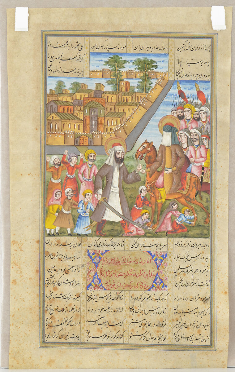 This illustrated folio is from a Shi'i epic recounting the life of 'Ali, the Prophet's son-in-law and, according to Shi'is, the legitimate successor to the Prophet. It depicts the Prophet Muhammad riding a camel accompanied by 'Ali after taking over a fortress inhabited by Jews. While the Prophet spares their lives, he orders them to leave with only a few of their belongings; we see the Jews throwing themselves at the foot of the Prophet’s camel and beg him to reconsider. As in other folios in the manuscript, the Prophet is depicted with a white face-veil while 'Ali's face is shown in full view. The style and palette of this folio are consistent with Qajar paintings of the 1820s and 30's. Shi'i epics were a popular genre in the Qajar period although only a few illustrated manuscripts survive, making this a rare example.