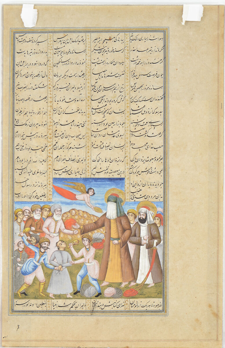 This illustrated folio is from a Shi'i epic recounting the life and exploits of 'Ali, the Prophet's son-in-law and, according to Shi'is, the legitimate successor to the Prophet. Both the Prophet, here wearing a white face-veil, and 'Ali are featured. The scene depicts a moment during the conquest of the Qamus fortress. The Prophet is shown reprimanding one of his followers (‘Abdullah) for getting drunk on wine and orders his attendants to punish him. The painting is rendered in a palette of pinks, blues and yellows typical of the Qajar period.