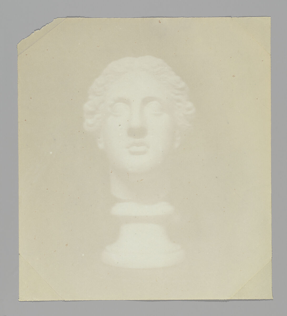 This luminous head seems to materialize before our very eyes, as if we are observing the moment in which the latent photographic image becomes visible. Nineteenth-century eyewitnesses to Hippolyte Bayard’s earliest photographs (direct positives on paper) described a similarly enchanting effect, in which hazy outlines coalesced with light and tone to form charmingly faithful, if indistinct, images. These works, which Bayard referred to as essais (tests or trials), often included statues and busts, which he frequently arranged in elaborate tableaux. In this case, he photographed the lone subject (an idealized classical head) from the front and side, as if it were a scientific specimen. The singular object emerges as a relic from photography’s origins and now distant past.