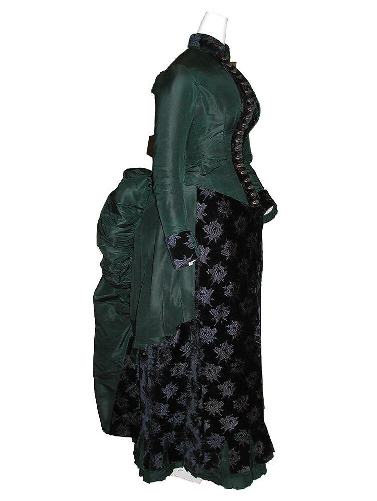 The bustle was at its greatest extension by 1885. It was almost perpendicular to the back and heavily upholstered. The 1880s versions were as padded and heavily embellished as a drawing-room hassock of the period. It was a popular conceit that the cantilevers of these bustles could support an entire tea service. To sustain the greater weight of the 1880s gowns, light and flexible infrastructures were created with flexible materials-wire, cane, whalebone-held together by canvas tapes or inserted into quilted channels.