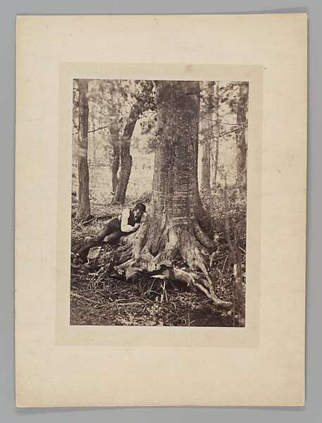 This work of art is currently on loan to the museum.Leaning against the trunk of a beech tree, the man in this picture wields a hidden instrument in the service of a mysterious task. Is he collecting botanical samples or carving a message into the bark? Remnants of past inscriptions on the trunk—visible through magnification—suggest the latter. In either case, it is clear that John Moran, who believed in photography’s ability to conjure delight in the contemplation of nature, saw the central figure as a surrogate: someone who left his mark on nature just as Moran left nature’s mark embedded in the surface of his light-sensitive paper.