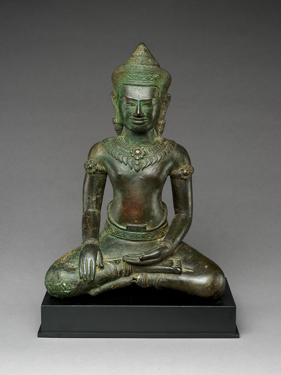 This crowned Buddha image was cast in Lopburi, the Khmer provincial capital located in central (modern day) Thailand in the early centuries of the second millennium. It reflects a new vogue in Buddhism for the crowned and bejeweled Buddha, adornment normally reserved for Buddhist saviors—bodhisattvas—not Buddhas. This reflected a new envisioning of the Buddha that drew on very early notions of the Buddha as a spiritual sovereign, a chakravartin. Eastern Indian models of the Pala period, which are known to have circulated, served as models for Lopburi artists to produce their very Khmer-style versions of this new Buddha-type.