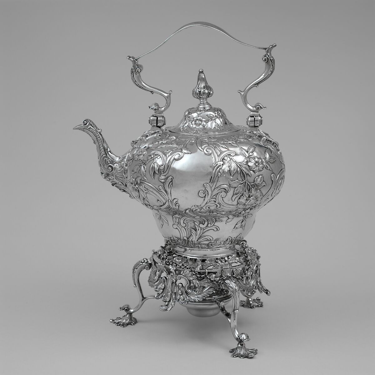 The wealthy colonial merchant Samuel Verplanck owned several pieces of London silver, including this teakettle-on-stand marked by Benjamin Breewood II in 1762. Its repoussé-decorated body, open floral stand, and shell-shaped feet represent the height of English rococo styling. Samuel was sent to study banking in Holland, where he met and married his cousin Judith Crommelin. The couple returned to New York in 1763 and moved into the family’s elegant Wall Street home. Verplank family silver, furniture, and paintings now in the Metropolitan’s collection exemplify the imported luxury goods owned by prominent colonists.