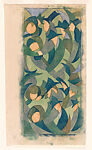 Here, in one of her most abstract works, Andrews depicted a group of city dwellers in London’s famous Hyde Park. Their bodies are distended and reduced to dark hats and coats out of which the occasional bit of skin emerges, such as their featureless faces. Despite the large size of the park, the thin vertical sheet and compression of figures create the impression of a crowded space, such as a Tube station. The cool tones and lush greenery they connote, however, undermine the stress of the density and congestion. The figures appear at peace in their surroundings, likely a statement about the restorative power of nature, especially necessary in urban spaces. Such links are further reinforced by the repetition of forms and colors, making the figures appear integrated into their surroundings.