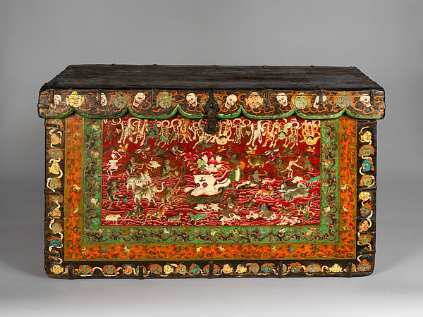 This chest likely doubled as an altar, placed before a wrathful deity in a protective shrine (gonkhang). Ceremonial utensils, stored inside the chest when not in use, were laid out on the lid during rituals. In the bloody scene on the chest dogs and vultures tear apart the dead, while other demons bear gory offerings, including a large decaying head. The head supports objects related to the five senses (equated with the five desires)—eyes for sight, a damaru drum for sound, a nose for smell, a tongue for taste, and a heart for touch.