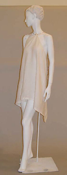 The work of Ronaldus Shamask reveals an architectural approach to clothing design. His garments, though soft and conforming to the body, can frequently be reduced to an origami-like planarity. Like an architect's blueprint, Shamask's concepts can be read in his patterns. Like a peplos or chiton, the garment does not rely on any fitting darts to take its form. Instead of the pins, buttons, or fibulae used in antiquity, Shamask asked the artist Michele Oka Doner to create a necklace that serves as the counterweight that keeps the dress on. Doner's work is often derived from her interests in natural forms and phenomena, and mystical and esoteric philosophies.