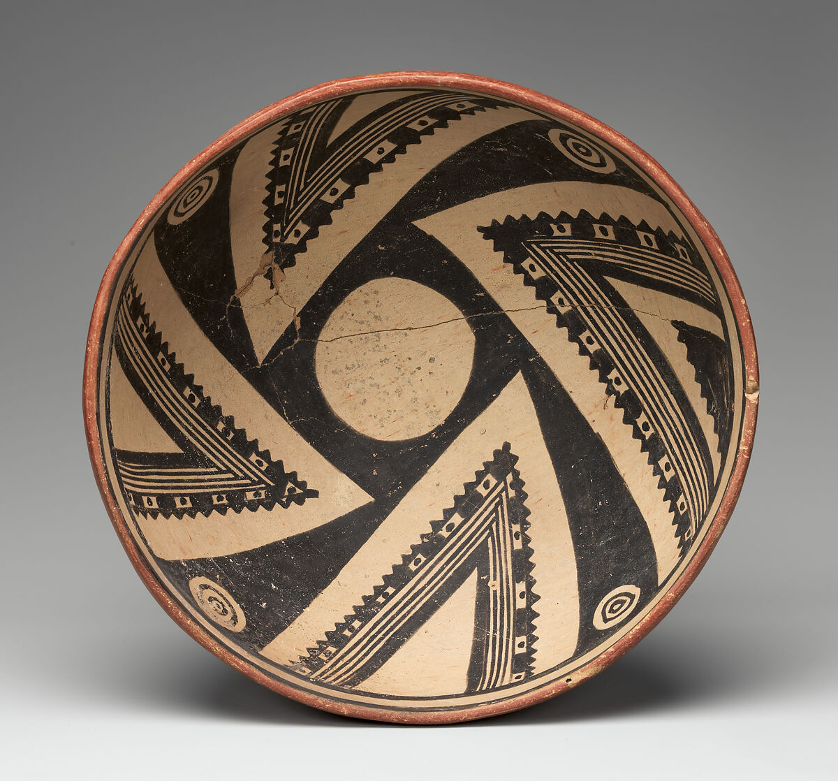 Diverse civilizations known collectively as Ancestral Puebloan flourished in the southwest of what is now the United States before the arrival of Europeans. Salado polychrome ceramics (also known as Roosevelt Red Ware) is a type of late prehistoric pottery found in Arizona and New Mexico. The striking geometric design is achieved by applying black and white slip over a red ware. Four circular "bull's eye" designs were painted below the interior rim.