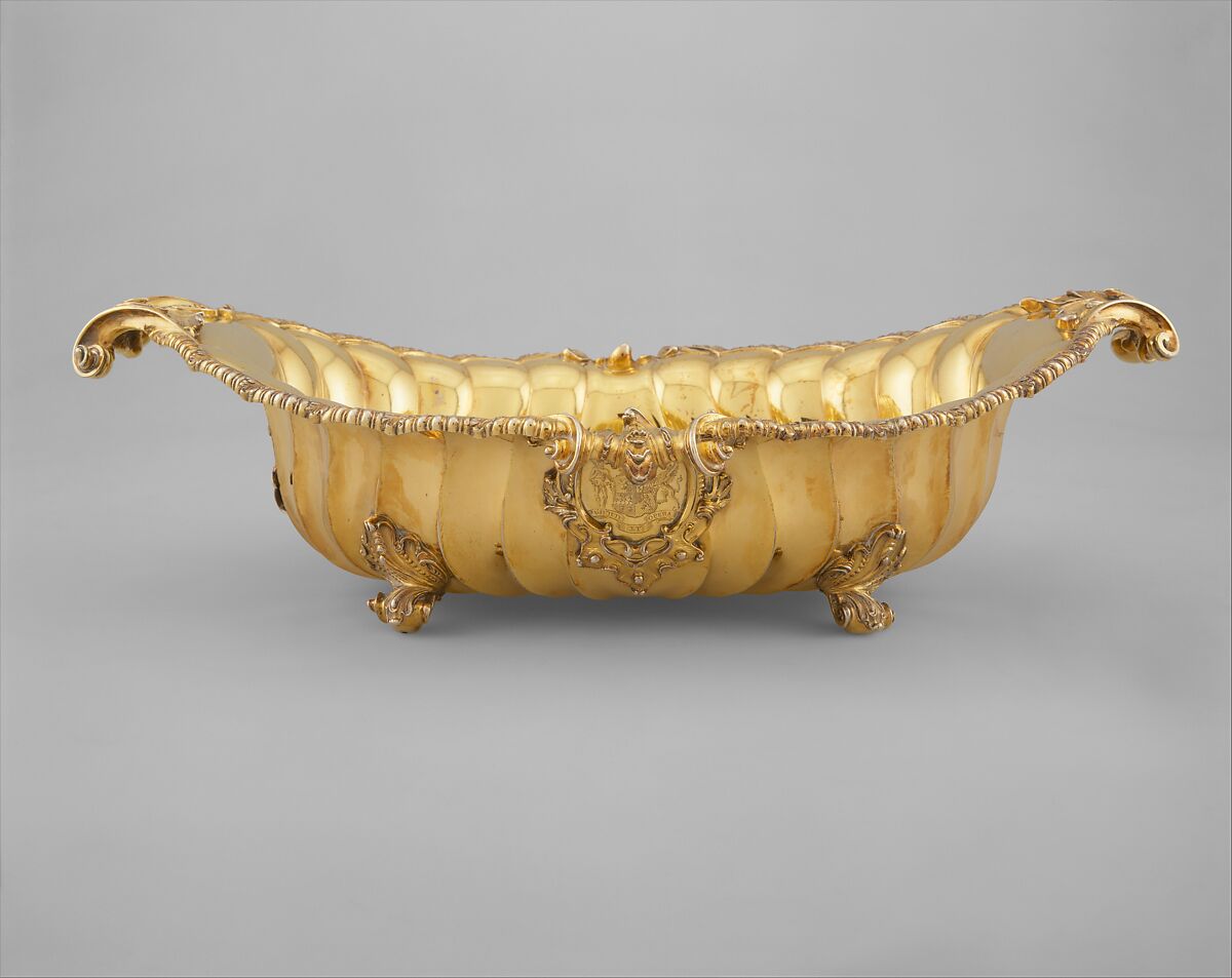 Thomas Heming, who registered his first mark in June 1745, made these gilded silver dishes during his term as principal goldsmith to King George III from 1760 to 1782. The symmetry and elegant decoration of these boat-shaped fruit bowls make a striking contrast to the Rococo style popular at the time. The arms engraved in the cartouches placed at the center of each side are those of the Scottish MP James, 2nd Earl of Fife (1729 - 1809), and his wife, Lady Dorothea Sinclair (1739 - 1818), daughter of Alexander, 9th Earl of Caithness.