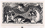 Tschudi studied at the Grosvenor School as well as in Paris with artists such as Fernand Léger and the Italian Futurist Gino Severini, both of whom influenced her desire to use repetitive geometric forms and portray movement in her art. The Tour de Suisse, a bicycle race begun in 1933, required cyclists to travel the narrow and vertiginous Klausen Pass, located in the mountains near where Tschudi lived. By compressing the riders and emphasizing the undulating Alpine path they navigate, she depicted the physical endurance and strength necessary for this endeavor rather than speed. A decorative border mirrors the interior patterns; it likely refers to the artist’s plan to print the image on fabric and marks the print as a rare example from the edition.
