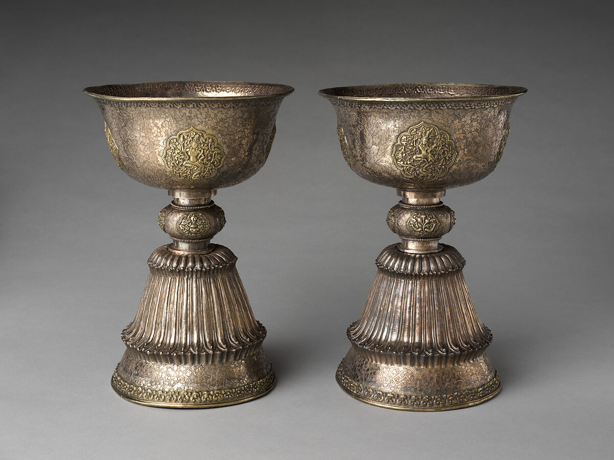These lamps were placed before images of deities, ready to receive offerings of ghee (clarified butter) that were used as fuel instead of oil. The pair evokes abundance and prosperity through their lotus-like form and finely engraved floral patterns. Auspicious Buddhist symbols (mangala) appear at the neck and foot of each lamp, while ornamental frames on the body display dancing celestial musicians.