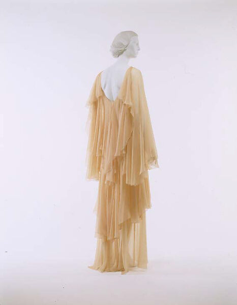 Handkerchief points and swallowtail folds are often best rendered in chiffons, jerseys, or crepe-fabrics with elastic qualities originating from the high-twist yarns employed in their weaving. Because of their ability to drape with fluidity, these fabrics have become associated in contemporary dress with classical effects. Holly Harp was a designer of dresses with romantic, often ethereal, effects. In silk and rayon jerseys and chiffon, her designs invariably explored the integral qualities of the fabrics.