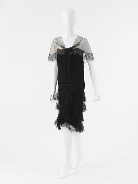 During the 1930s Chanel continued to exploit the dramatic possibilities of black, often using it to enhance the romantic and seductive appeal of her lace evening dresses. Lace possesses a natural elasticity that allows it to cleave to the wearer's contours, a quality that appealed to Chanel's compulsive fixation on the accommodation of the body. Rarely loose, yet rarely tight, Chanel's lace dresses never constrain the torso through rigid underpinnings. However, some of her lace gowns of the late 1930s do incorporate boning, a technique Chanel employed not to reorganize the body but to achieve an off-the-shoulder décolleté that could not rely on straps or sleeves for support.